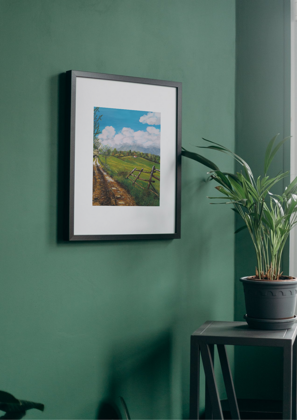 This digital print captures a serene dirt path winding through lush green hills, framed by a charming wooden fence and distant cottage under a bright blue sky dotted with fluffy clouds.